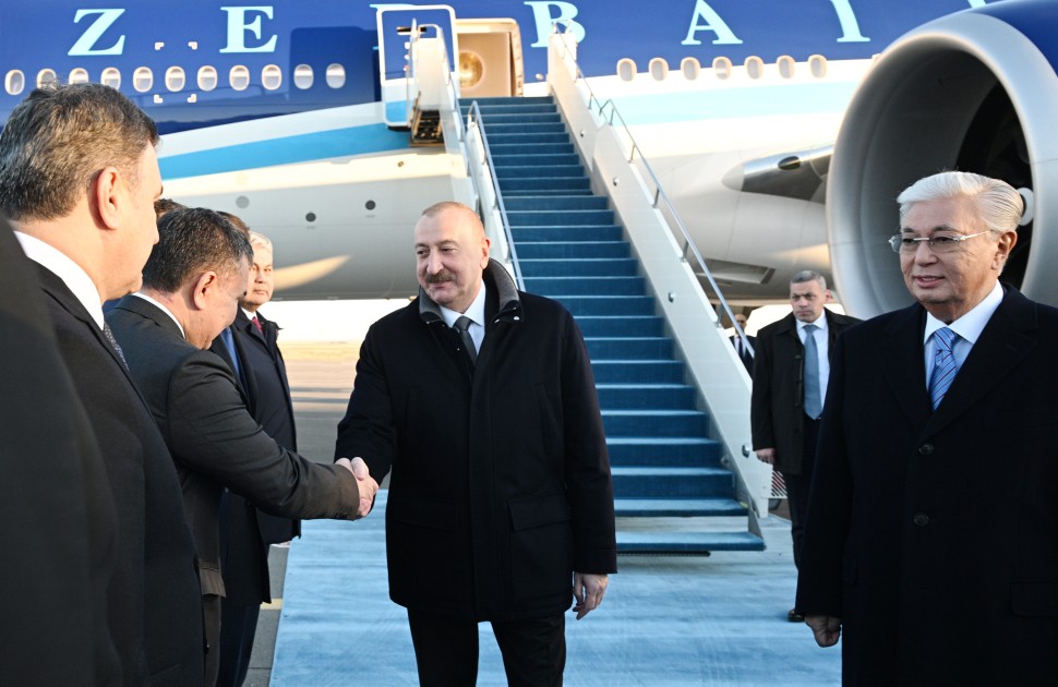 Dövlətimizin başçısını Qazaxıstan Respublikasının Prezidenti Kasım-Jomart Tokayev qarşıladı.