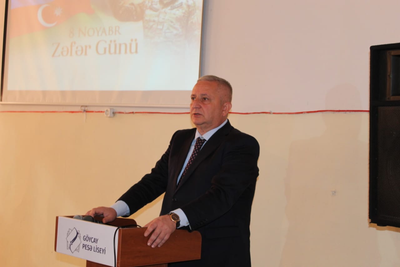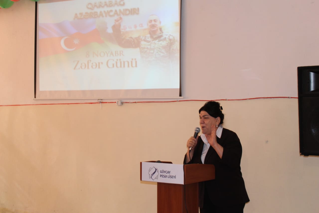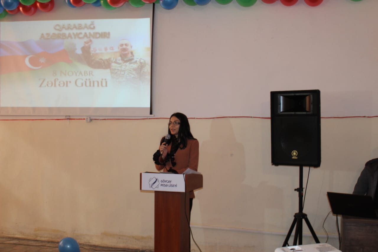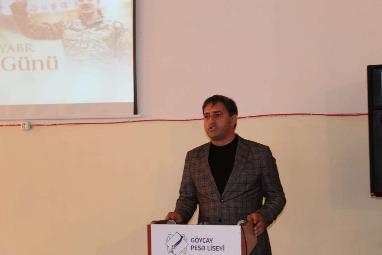 Liseyin direktor əvəzi Elxan Əliyev çıxış edərək, “Zəfər Günü” münasibəti ilə tədbir iştirakçılarını təbrik edərək gələn qonaqlara təşəkkürünü bildirib. Şəhidlərimizə Allahdan rəhmət, ailələrinə səbir diləyib. 8 Noyabr – Zəfər Günü Azərbaycan xalqının tarixində qürur, şərəf və birlik rəmzinə çevrilmiş ən möhtəşəm hadisələrdən olduğunu qeyd edib. Azərbaycanın öz müasir tarixinin ən parlaq səhifəsini – Zəfər Gününü qeyd etdiyini vurğulayan liseyin diektoru 44 gün davam edən Vətən müharibəsinin xalqın birliyini, milli ruhun sarsılmazlığını, dövlət-xalq-ordu həmrəyliyinin gücünü bütün dünyaya nümayiş etdirdiyini vurğulayıb.