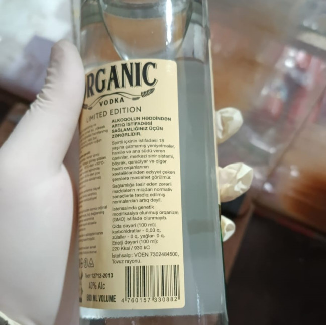 Bildirilib ki, marketdə ümumi sayı 62 ədəd “Gold Organic”, “Organic Vodka”, “Lux Organic” əmtəə nişanlı mənşəyi məlum olmayan saxta alkoqollu içkilər müəyyən edilərək satışdan kənarlaşdırılıb. Məhsullardan nümunələr götürülərək laborator müayinələrə cəlb olunub.