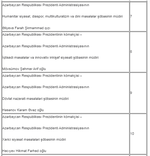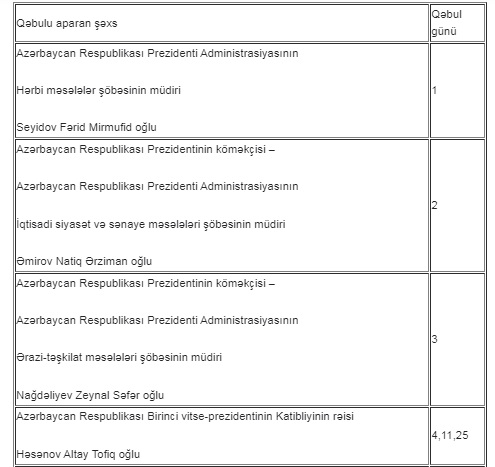 Qeyd: Vətəndaşlar Azərbaycan Respublikası Prezidenti Administrasiyasının Vətəndaş Qəbulu Mərkəzində qəbul olunurlar.