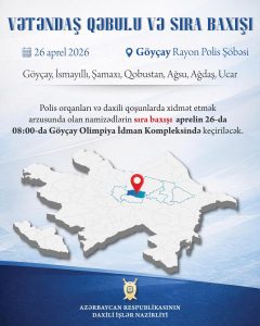 Polis orqanları və daxili qoşunlarda xidmət etmək arzusunda olan namizədlərin sıra baxışı aprelin 26-da 08:00-da Göyçay Olimpiya İdman Kompleksində keçiriləcək.Qeyd edək ki, qəbula və sıra baxışına gələnlərdən şəxsiyyət vəsiqəsi tələb olunur.