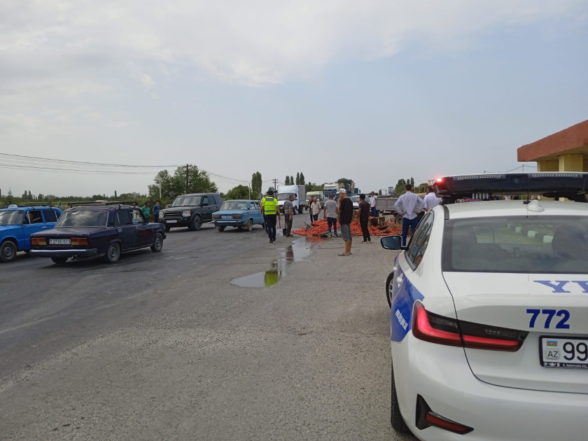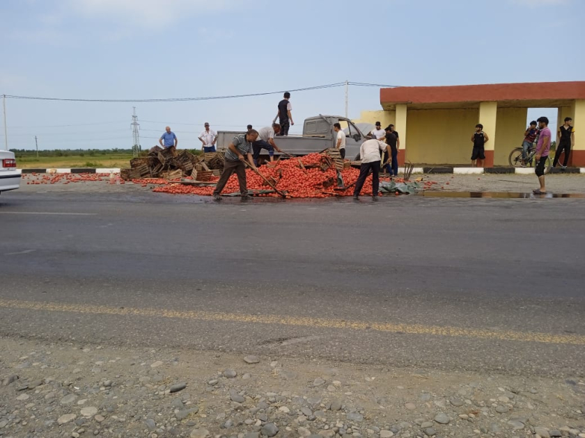 Yük avtomobili idarəetmənin itirilməsi nəticəsində yolun hərəkət hissəsində aşıb. Qəza nəticəsində xəsarət alan olmasa da, 3 tondan çox pomidor yola dağılıb.