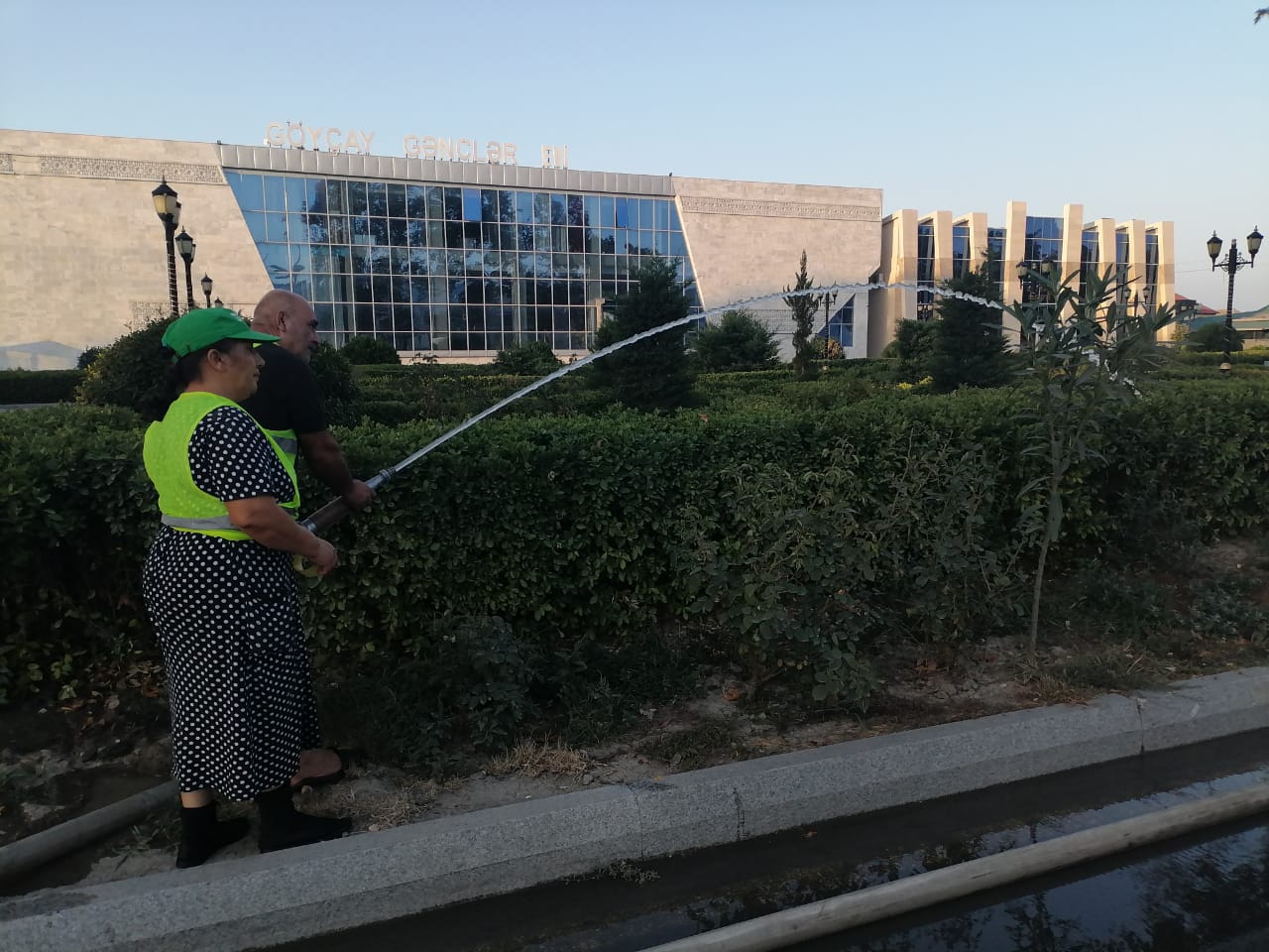 Düzgün.az xəbər verir ki, yay mövsümünün isti keçməsi nəzərə alınaraq Göyçayda mövcud yaşıllıqların vaxtı-vaxtında suvarılması Yaşıllaşdırma sahəsi tərəfindən nəzarətdə saxlanılır.Yaşıllıq sahələrində ağacların və güllərin diblərinin boşaldılması, gübrələrlə təmin edilməsi, həmçinin yaşıllıq sahələrində bərpa işlərinin aparılması istiqamətində zəruri tədbirlər görülür.